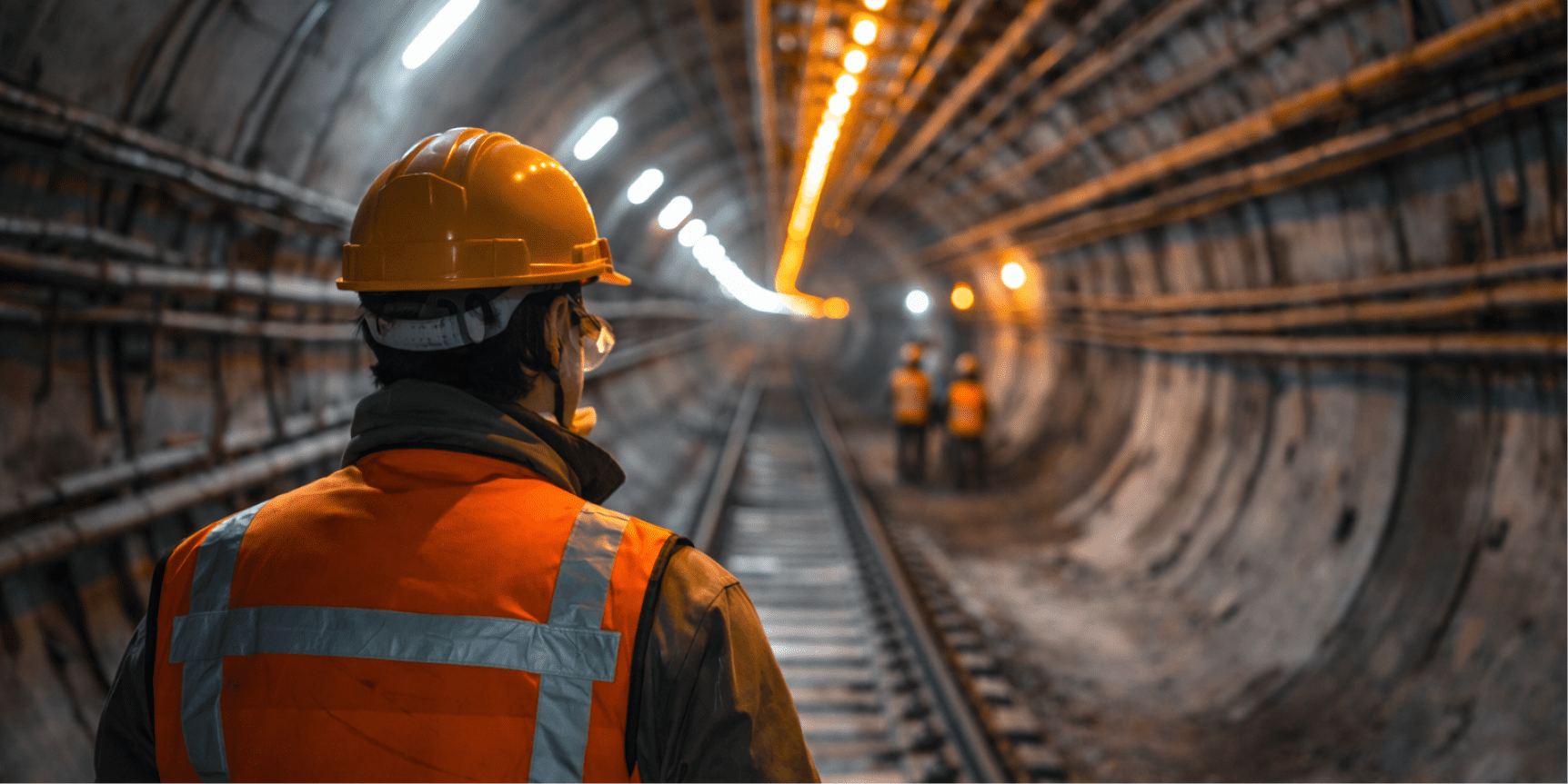 A construction worker in a hard hat and orange vest stands on tracks in an illuminated tunnel, part of a connected jobsite.